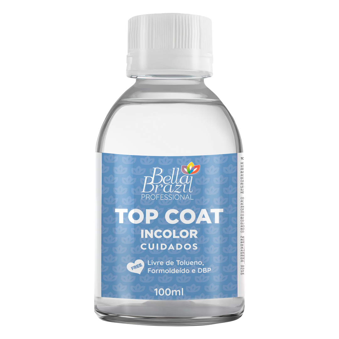 Aplique uma camada do Top Coat Incolor sobre o esmalte seco para finalizar e proteger. Reaplique conforme necessário para manter o brilho e a durabilidade.